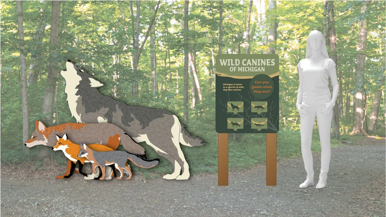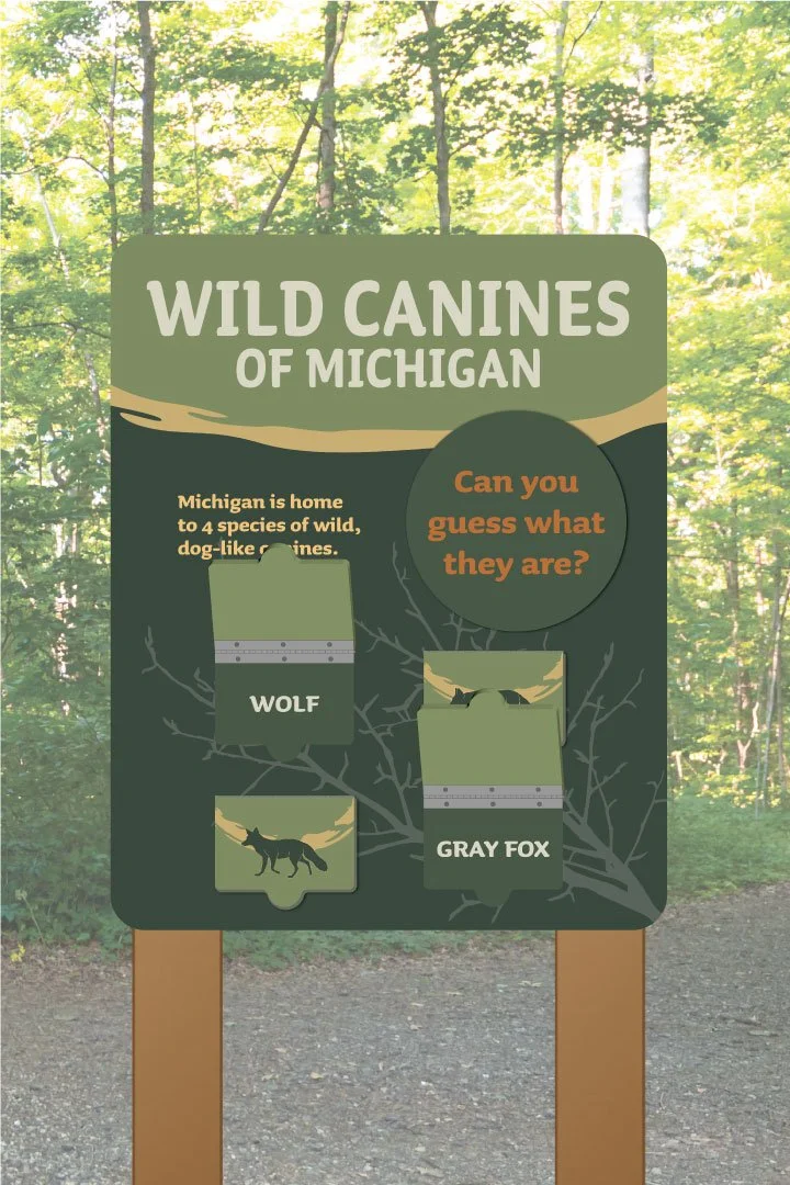 Howell Nature Center features the Wild Wonders Wildlife Park where they showcase rehabilitated animals and educate the public on how to be better stewards of nature. I designed interactive interpretive displays on beavers, woodchucks and canines found in Michigan that melds with the center’s branding.