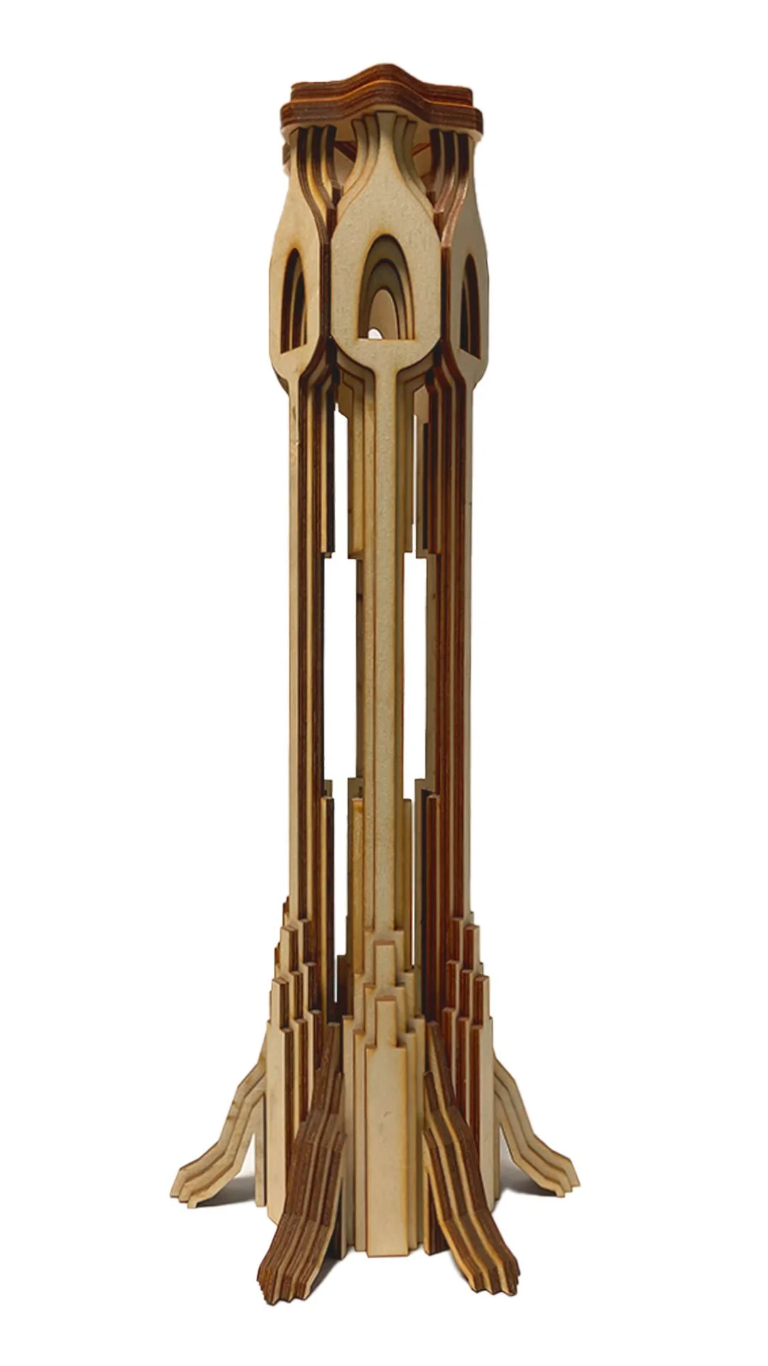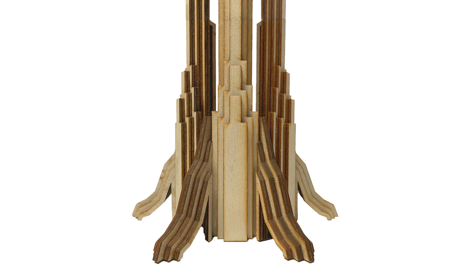 The QR cube is accompanied by an art deco inspired stand made out of mahogany veneer. It’s meant to blend into Elderwood’s wizard workshop-like convention booth. I designed this stand within Elderwood’s core competency using the laser cutter and materials available. Despite its intricate look, the design can be easily assembled because of the repetition of parts and hidden instructional lines etched into each piece.